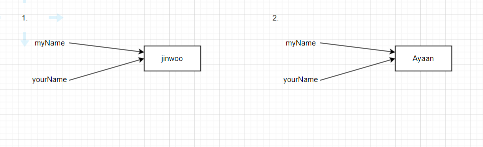 1. yourName은 myName과 함께 "jinwoo" 문자열이 저장된 메모리공간을 가리키고 있을것이다.