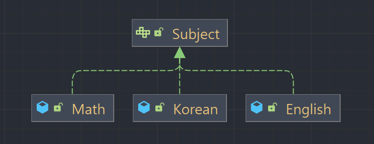 Student객체를 보면 studyingSubject 변수의 타입이 Math이다. 이렇게 되면 수학 말고 국어나 영어를 공부하려면 Student객체를 다시 짜야한다. 즉 학생이 Concret Class에 의존하고 있는 상황이다.