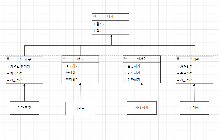 위 클래스의 남자친구, 아들, 회사원, 소대원에게는 모두 전화하기 메서드가 존재한다. 따라서 전화하기에 문제가 생기면 남자친구, 아들, 회사원, 소대원 모두를 손봐야한다. 이런 경우를 산탄총 수술이라 하며 이를 해결하는 법은 간단하다.